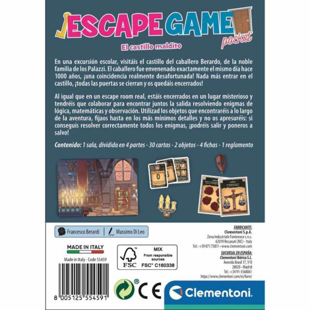 Un castillo que esconde pistas y misteriosos enigmas que sólo un buen detective puede revelar, para una aventura divertida que emocionará a grandes y pequeños. Un juego con cartas y muchos misterios que resolver para poder salir del castillo, ¡como en un escape room de verdad! Un entretenimiento único y una aventura para disfrutar enigma tras enigma, desarrollando la lógica, el pensamiento matemático, la capacidad de observación y el lenguaje. Cada carta esconde una pista para continuar la aventura e intentar salir del castillo. El juego incluye una baraja de cartas con enigmas, un tablero y otros objetos útiles para encontrar las pistas. Un juego ideal para adultos y niños que sigue una tendencia muy actual, la del escape room, para jugar juntos y estimular el intelecto divirtiéndose. Jugadores:1-6 personas. Idioma: Castellano. Edad recomendada: + 8 años. No recomendable para menores de 3 años, ya que contiene piezas pequeñas que podrían provocar asfixia en caso de ser ingeridas por el niño/a. Fabricante y Persona Responsable en la Comunidad Europea: CLEMENTONI IBERICA S.L. Avda. Brasil N17 Piso 11B, Madrid, 28020, Madrid, España Teléfono: 91 556 80 61